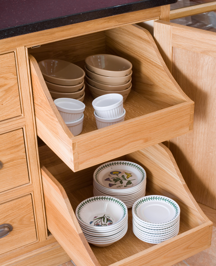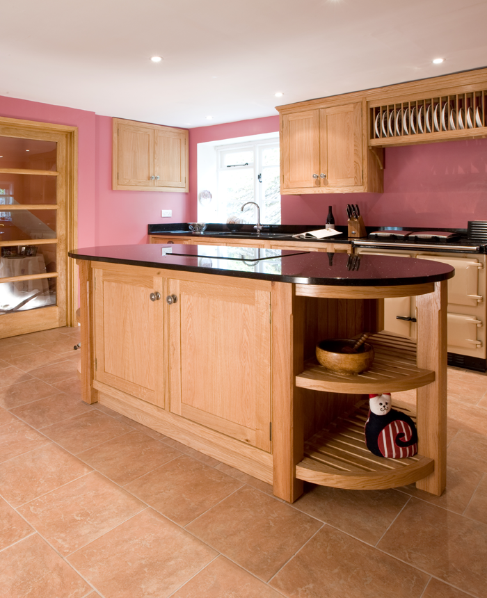 This large oak kitchen with black Star Galaxy granite worktops neatly balances the traditional with the contemporary. The large island unit accommodates a hob and cooker, allowing the Cook to face the room when cooking, and the rounded ends make moving around the kitchen very easy.