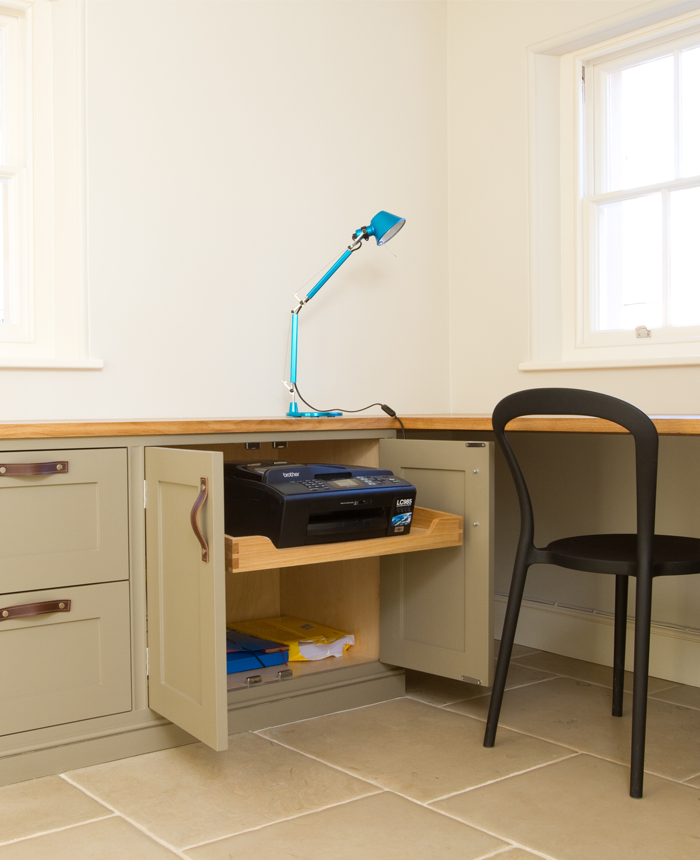 A small study space painted in Farrow and Ball “Mouses Back” with leather strap handles and oak top. The integrated filing, printer storage and drawer dividers help everything stay in its place and tidy.
